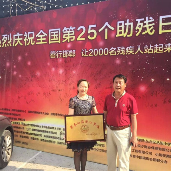 2015年5月17由河北省殘疾人創(chuàng)業(yè)基金會邯鄲市慈善中心、邯鄲市殘聯(lián)肢體殘疾人協(xié)會、邯鄲電視臺公益聯(lián)盟欄目共同發(fā)起,善行邯鄲"讓2000名殘疾人站起來"大型公益活動,聯(lián)合社會各界愛心人士,愛心單位伸出援助之手,讓更多的殘疾朋友能夠站立起來。